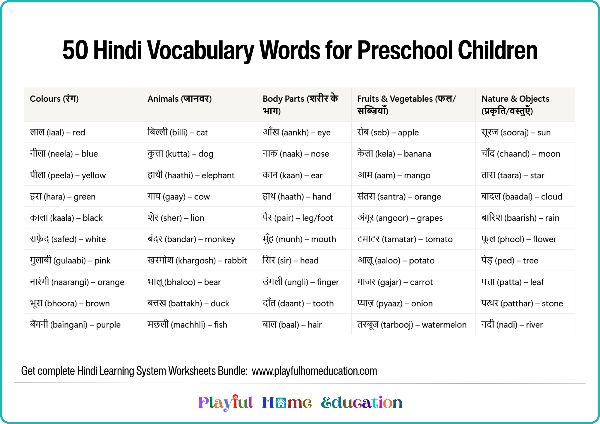 Here is a sample set of important vocabulary words that are taught at preschool level to Hindi learners.